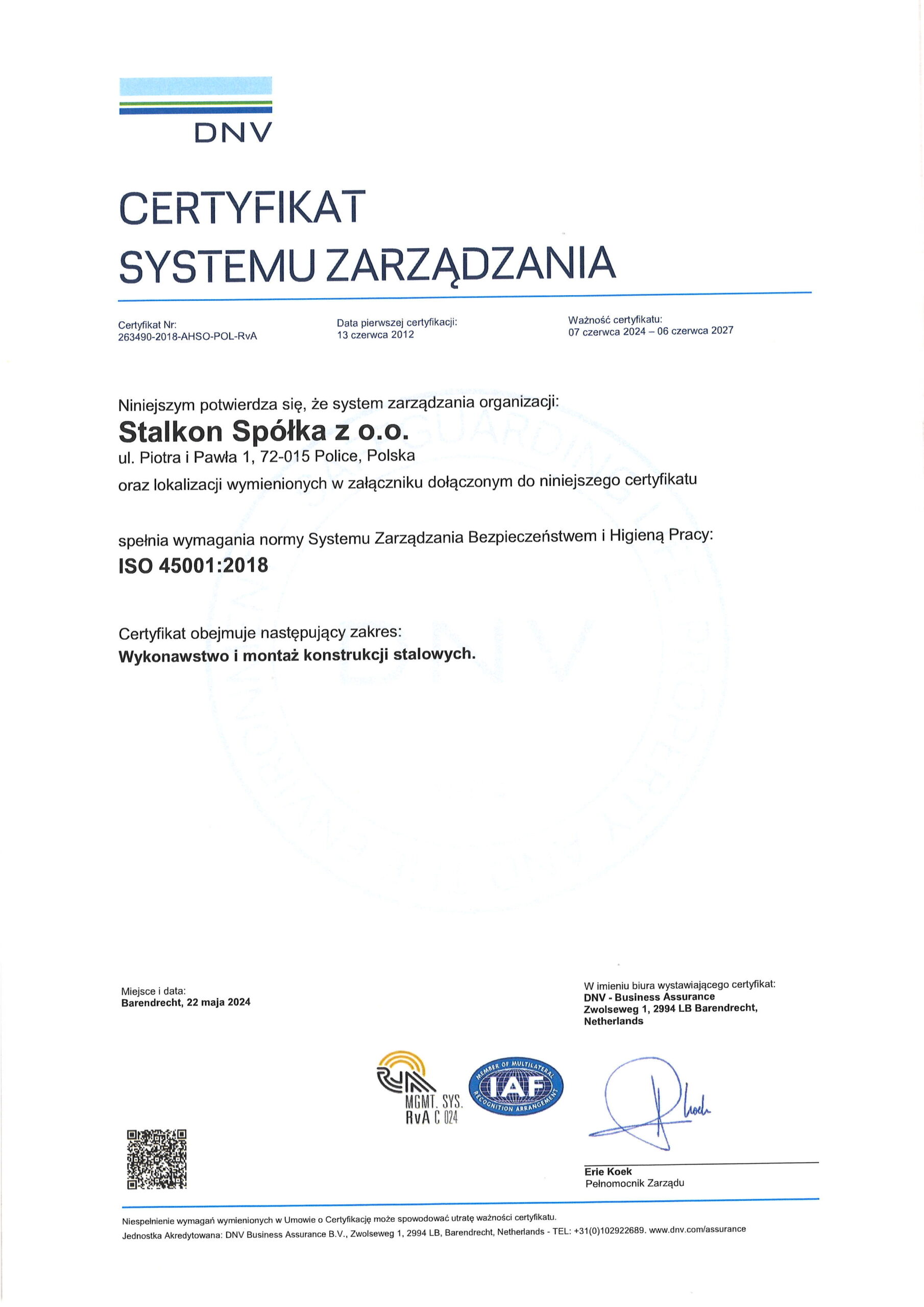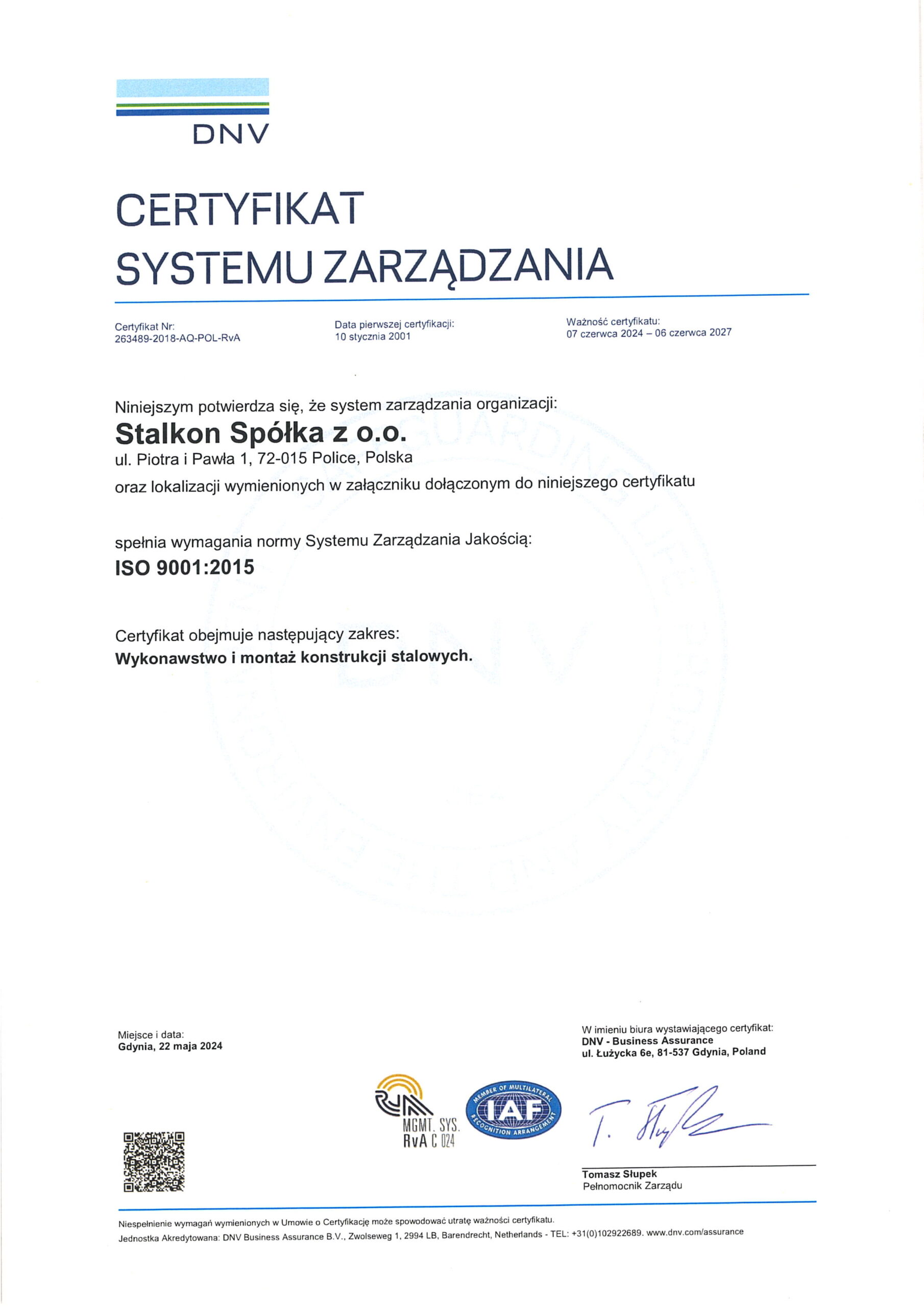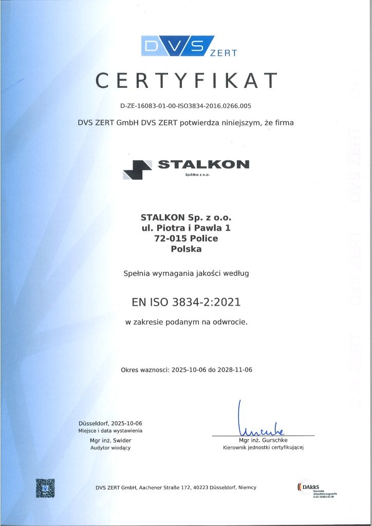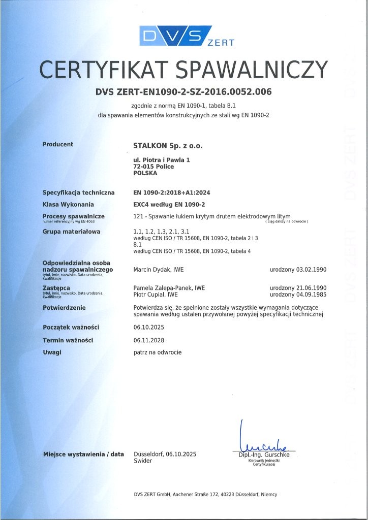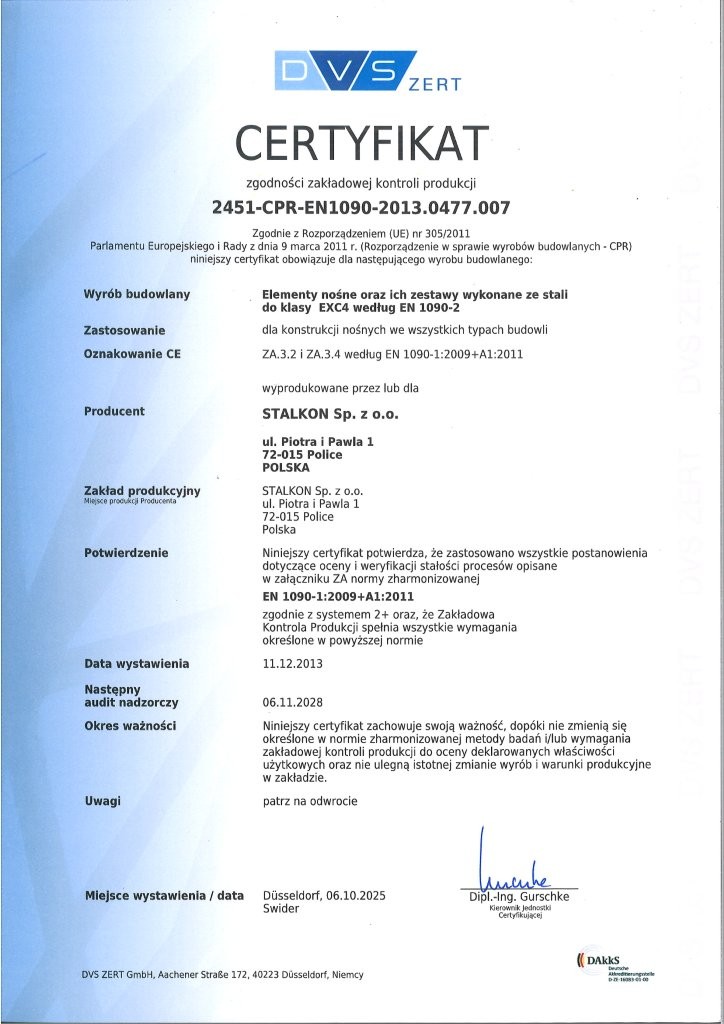 Stalkon Sp. z o.o. produkuje konstrukcje stalowe na najwyższym, sprawdzonym poziomie jakości, co potwierdzają liczne certyfikaty i uprawnienia: