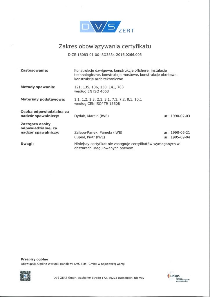 Proces spawania prowadzimy zgodnie z zatwierdzonymi WPQR-ami, spełniającymi normy ISO 15614-1, NORSOK M-101 oraz DNV-OS-C401. Współpracujemy z renomowanymi instytucjami certyfikującymi, takimi jak GSI SLV, GL, DNV, TÜV Rheinland i inne.